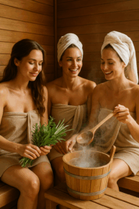 ハーブサウナは、通常のサウナの熱・蒸気に植物の香りと効能を重ねるスタイルです。蒸気を浴びるときにハーブを入れた桶の湯気を立てることで、香りが室内全体に広がります。